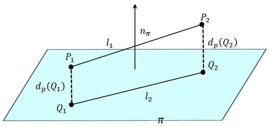 Let two 3D line segments be denoted as and , where are the reconstructed endpoints in Euclidean coordinates. A supporting plane is constructed using the three non-collinear points , , and . The unit normal vector of the plane is computed by [,]