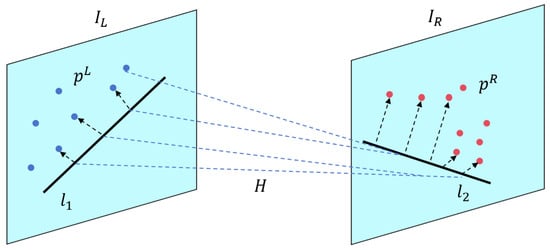 As illustrated in Figure 4, let and denote a matched line pair in the left image and right image , respectively. Around each line, a set of neighboring supporting points is sampled (e.g., gradient-aligned or SURF matches), denoted as and . Under the planarity assumption, these two neighborhoods are related by a homography matrix []: