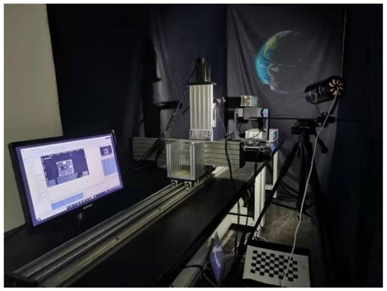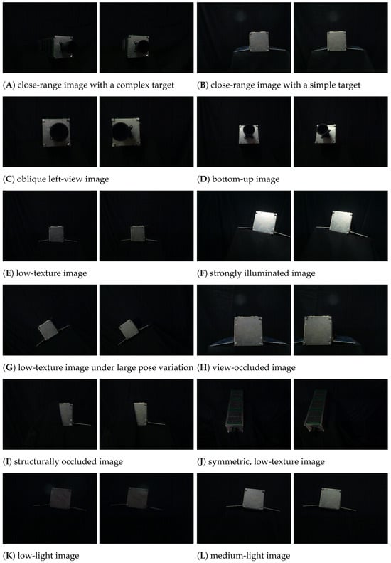 This study focuses on line segment matching algorithms for non-cooperative space targets, which require reliable experimental data for thorough validation. However, existing stereo datasets specifically designed for such targets are limited. To enable a more rigorous and effective performance analysis, we constructed a semi-physical simulation platform that emulates the key photometric attributes of the space environment, namely directional and high-contrast illumination, while allowing for controlled data acquisition. As illustrated in Figure 5, the experimental system consists of a three-degree-of-freedom linear rail, a three-axis turntable, a solar illumination simulator, a stereo camera setup with adjustable baseline, two physical CubeSat models, and a background panel representing Earth. The solar simulator emulates the lighting conditions in space, while the linear rail captures target images at varying distances and the turntable controls target orientation. This semi-physical platform enables the generation and acquisition of datasets tailored for the validation of stereo line segment matching algorithms.