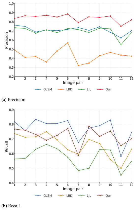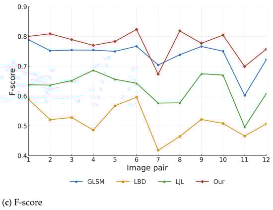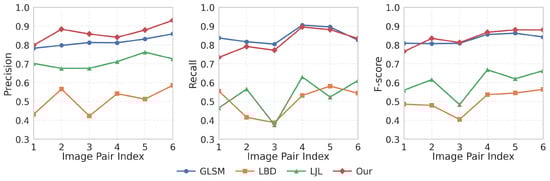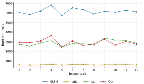 Overall runtime comparison. Figure 13 shows the runtime of four representative methods across twelve stereo image pairs. LBD achieved the fastest runtime (∼600–700 ms), reflecting its lightweight design but sacrificing geometric robustness. LJL required significantly longer runtimes (2500–3300 ms), trading higher computational cost for stronger consistency. The proposed method achieved comparable runtimes to LJL (typically 2500–3000 ms), while GLSM was the slowest (∼2 × LJL), primarily due to its iterative random walk optimization and line-point graph construction. To facilitate deeper analysis, a representative runtime of 3000 ms is adopted for the proposed method.