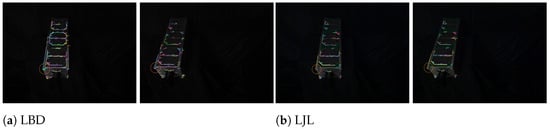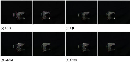 In the highlighted orange circular region of Figure 12d, our proposed method correctly matches two line segment pairs No. 11 and 25 with no mismatches. This corresponds to 2/2 correct correspondences, compared with GLSM (2/6), LJL (1/1), and LBD (1/7). In addition to achieving perfect accuracy within the region of interest, our framework effectively suppresses mismatches and preserves structural consistency. These results demonstrate that the proposed method maintains reliable performance even under the challenging conditions of symmetry and weak texture.