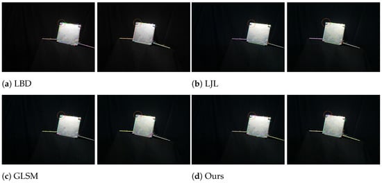 As shown in the orange circular area of Figure 11a, the LBD method detects numerous line segments in overexposed areas; however, the lack of discriminative textures and contrast produces many incorrect matches.