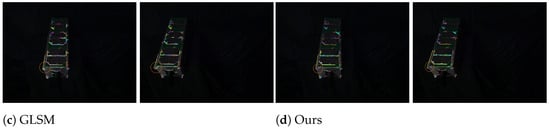 In the highlighted orange circular region of Figure 11d, our proposed method correctly matches four line segment pairs No. 3, 11, 19, and 38, with only one error at No. 22. This corresponds to 4/5 correct correspondences, while GLSM achieves 3/6, LJL 1/1, and LBD only 2/9. In addition to maintaining the highest precision, our framework preserves geometric consistency and directional stability across matches. These results demonstrate that the proposed method remains robust and reliable for correspondence estimation under strong illumination variations.