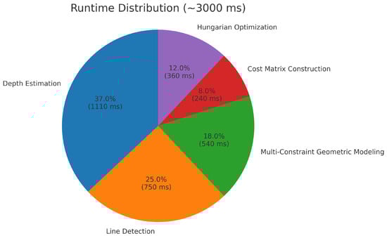 The breakdown is illustrated in Figure 14. Depth estimation and line detection dominate the runtime due to the large number of pixel- and gradient-level computations. The multi-constraint geometric modeling step introduces moderate overhead, since only progressively reduced candidate pairs are processed by the coplanarity, homography, angular, and distance-ratio constraints. In contrast, cost matrix construction and the Hungarian assignment remain relatively lightweight, as the number of surviving pairs before global optimization is already limited by the preceding filtering strategy. Nevertheless, Hungarian optimization is still retained as a necessary global step, enforcing one-to-one consistency beyond what local thresholds alone could achieve.