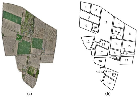 This study selected Huaxing Farm in Xinjiang (44°13′ N, 87°17′ E) as the primary research area, employing a DJI Mavic 3 drone (DJI, Urumqi, China) as the data acquisition equipment to obtain spatial information data of the experimental farmland. The flight altitude was set at 110 m with a flight speed of 15 m/s, and the latitude and longitude coordinate data of the operational fields were ultimately stored in the appropriate format. To ensure precise field boundary accuracy, detailed annotations were made for the farm boundaries and individual field boundaries within the research area from the collected map data. The position coordinate system of the data acquisition equipment was WGS84 (World Geodetic System 1984). For the convenience of subsequent geometric modeling, the map data were converted to the UTM (Universal Transverse Mercator) coordinate system. This study develops a geospatial data processing algorithm for parcel data coordinate transformation based on geographical projection transformation methods. By constructing a spatial coordinate transformation model, the original longitude and latitude data of parcels are converted to planar projection coordinates. This achieves precise mapping from geographic coordinates to image coordinate systems, ultimately generating parcel boundary vector images with well-defined geometric characteristics. To further ensure experimental accuracy, the fields were sequentially coded from 1 to 27, with the experimental fields and their numbering shown in Figure 1.