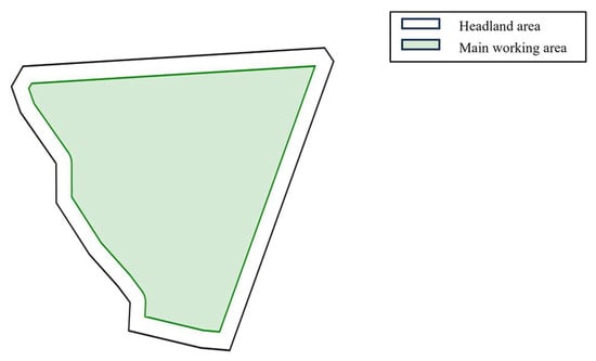where R represents the minimum turning radius of the agricultural machinery (m), θ represents the angle between the current operation driving direction of the agricultural machinery and the x-axis (°), and ω represents the working width. In the modeling process, the headland width (Wh) is calculated using Equation (1), and an inward buffer operation is employed to translate the field boundaries equidistantly inward, constructing the boundary lines between the headland area and the main working area to ensure sufficient turning space is reserved in the headland area within the geographical space. This division method establishes an accurate geometric foundation for subsequent agricultural machinery path planning and operation simulation. The simulation modeling results of field regional division are shown in Figure 2.