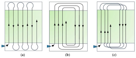 Figure 4. The common agricultural machine sowing methods. (a) Shuttle sowing; (b) centripetal sowing; (c) circuitous sowing. Schemes (b,c) are presented here as traditional examples, but due to their higher idle passes they are not adopted in the proposed method.