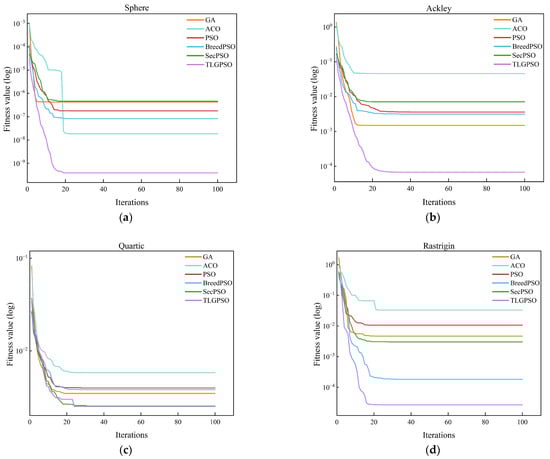To validate the practical performance of the improved particle swarm optimization algorithm (TLG-PSO) in agricultural machinery path optimization, a comparative algorithm experiment was conducted with the objective of minimizing the effective operational path length. The experimental parameters for the agricultural machinery were set as follows: the working width ω was 5 m, and the minimum turning radius was 2.5 m. The parameters for TLG-PSO were configured as follows: population size N = 50 and maximum iteration count T = 100. The comparison algorithms included Genetic Algorithm (GA), Ant Colony Optimization (ACO), Particle Swarm Optimization (PSO), Hybrid Particle Swarm Optimization (BreedPSO), and Second-Order Oscillating Particle Swarm Optimization (SecPSO), with all algorithms maintaining consistent parameter settings. The convergence curves shown in Figure 10 display the optimization iteration processes of GA, ACO, PSO, BreedPSO, SecPSO, and TLG-PSO under four different fields. The path optimization results of TLG-PSO and the other five comparison algorithms across various fields are presented in Table 5.