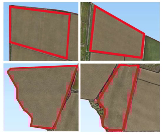 To evaluate the adaptability and robustness of the proposed path planning method across different field geometries, this study selected four representative fields from the Huaxing Farm in Xinjiang—namely, Field 1, Field 4, Field 12, and Field 16—as experimental cases. These fields range from nearly regular rectangular shapes to highly irregular polygons, effectively capturing the diverse landform characteristics commonly encountered in agricultural production across the region.