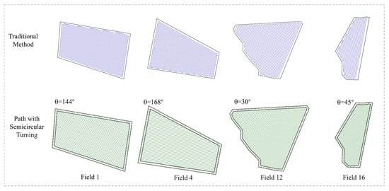 These findings clearly validate the effectiveness of the proposed algorithm in minimizing path length and reducing turning frequency. Its advantages are especially evident in complex and irregularly shaped fields, underscoring its adaptability and robustness. By determining the optimal heading direction through intelligent algorithmic optimization, the method not only enhances the efficiency of agricultural machinery operations but also contributes to a significant reduction in labor costs. Figure 9 presents visual comparisons of full-coverage operation paths generated by the two planning methods for the four typical fields (Field 1, Field 4, Field 12, and Field 16), which represent a gradual transition from near-regular to highly irregular shapes.
