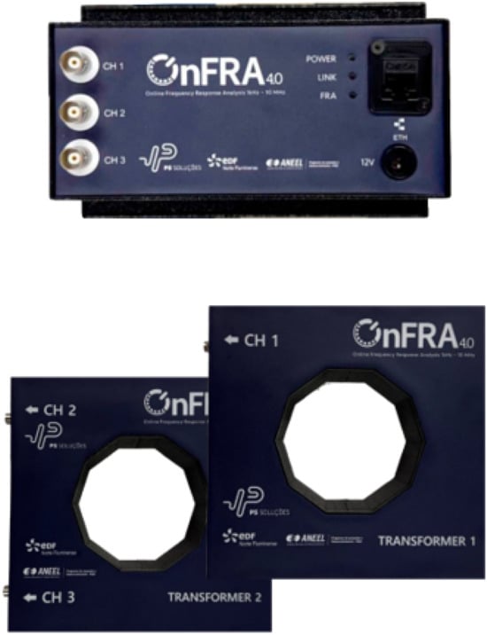 is computed and compared against reference curves to identify deviations associated with insulation degradation or mechanical faults. In contrast to conventional offline FRA techniques, OnFRA® 4.0 supports continuous monitoring under load conditions by employing galvanically isolated injection and acquisition modules, which ensure signal integrity and safe operation on energized equipment [12,13,14].