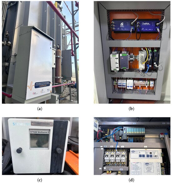 The installation process also involved the design and routing of communication links between the panels and the SCADA system. Ethernet switches and optical fiber transceivers were used to ensure robust data transmission with immunity to electromagnetic interference, a common challenge in high-voltage environments. Figure 5 shows the assembled diagnostic panel and the gas sensor installed, as well as the electrical measurement cabinet based on PLC.