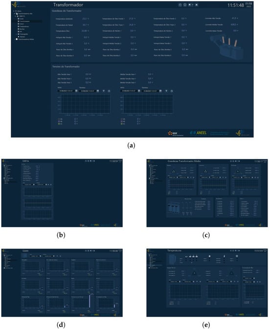 Screenshots of the SCADA supervisory interface showing real-time and historical monitoring data for the power transformer, including gas concentration, temperature, electrical parameters, and frequency response analysis. (a) General overview of the SCADA interface displaying the monitored transformer and its main diagnostic parameters. (b) Visualization of frequency response analysis results from the OnFRA® module. (c) Electrical measurements dashboard with voltage, current, and power measurements. (d) Real-time dissolved gas concentration monitoring screen. (e) Oil temperature monitoring interface, indicating thermal behavior during operational conditions.