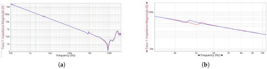 Frequency response results obtained with OnFRA® 4.0 during laboratory fault simulation. The red curve represents the baseline condition (normal operation), while the blue curve corresponds to the response under fault conditions. Subfigure (a) presents the global impedance response, and subfigure (b) details the mid-frequency region where the most significant changes occur due to the controlled inter-turn short circuit. (a) Overall frequency response spectrum comparing normal and fault conditions. (b) Zoomed view highlighting deviations in resonance and anti-resonance behavior after fault insertion.