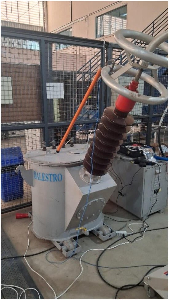 The FRACTIVE® 4.0 system enables real-time monitoring of bushing insulation by acquiring the frequency response from the test tap. In this study, a capacitive bushing type GOB 380 from ABB (100 kV, 800 A), with pF and at 10 kV (Figure 9), was used for degradation simulation. The FRACTIVE® 4.0 was connected via a long shielded cable to the test tap, enabling non-invasive impedance and admittance measurements over a broad frequency spectrum.