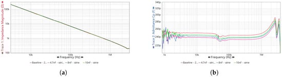 Conversely, the parallel capacitance curves exhibit clear and progressive deviations in the mid-frequency range (10 kHz–1 MHz) as the additional capacitive elements (4.7 nF, 8 nF, and 10 nF) are introduced. These deviations are characterized by an upward shift in the capacitance baseline, reflecting the effect of the parallel capacitive paths created during the fault simulation.