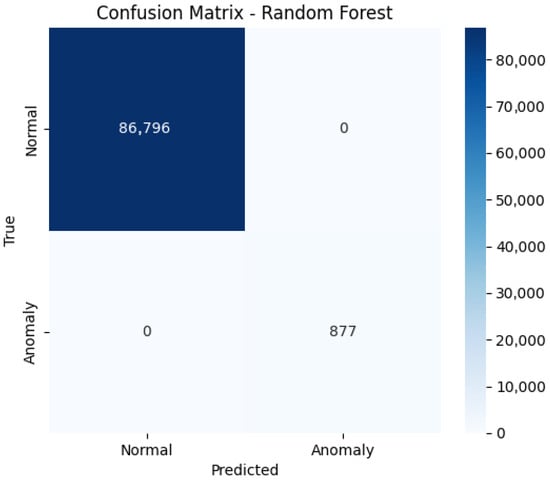 Confusion matrix for the Random Forest classifier, showing perfect separation between normal and anomalous samples.