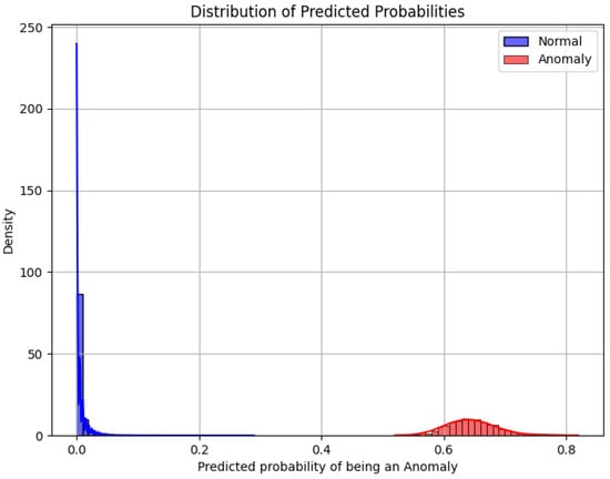 The clear separation between the probability distributions demonstrates that the classifier not only achieves correct binary predictions but also provides confidence scores that are well calibrated and reliable. This capability is relevant for applications that require uncertainty quantification, such as risk-based anomaly prioritization or adaptive decision thresholds.