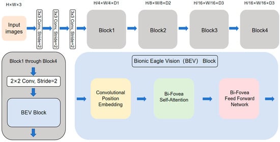 The architectural framework of EViT incorporates three fundamental components: a convolutional stem, multiple 2 × 2 convolutional operations, and Bionic Eagle Vision (BEV) modules. Critical implementation details include: the 2 × 2 convolutional operators employ a stride setting of 2 layers to facilitate patch embedding; adhering to established hierarchical paradigms [31,32,33], the network organizes its computation into four structurally homologous stages; and progressive feature resolution reduction (4×, 8×, 16×, and 32× scaling factors across stages 1–4, respectively) coupled with channel dimension expansion (D1 through D4).