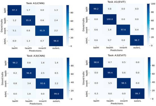 The comparative performance evaluation of different diagnostic models is illustrated in Figure 7, which presents the confusion matrices for both CNN and EViT architectures when processing tasks A1 and A3. The experimental data reveals remarkable diagnostic capabilities across all fault categories, with classification accuracy consistently surpassing 95% for each fault mode while maintaining minimal false positive rates—findings that align perfectly with the outstanding test accuracy documented in Table 3. Notably, the transformer-based EViT approach demonstrates significantly better fault identification performance than conventional CNN, particularly in detecting mechanical anomalies, thereby conclusively confirming the methodological advantages of the proposed framework.