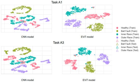 Subsequently, visual validation was performed on the features extracted from event data using different methods. Specifically, the fully connected features from the final layer of the deep neural network were extracted and visualized through t-SNE dimensionality reduction. The results for tasks A1 and A3 are presented in Figure 8. The visualization demonstrates that compared to the CNN model, samples processed by the EViT model exhibit tighter intra-class clustering and more distinct inter-class boundaries across different health states. This clearly illustrates EViT’s superior effectiveness in event data-based fault pattern recognition.