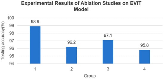 In order to validate the effectiveness of individual modules in the EViT model for fault diagnosis, we conducted ablation studies on the BFSA, BFFN, and CPE modules. Experimental Group 1 employed the complete EViT model, Group 2 replaced the BFSA with standard MHSA, Group 3 substituted the BFFN with a standard FFN, and Group 4 removed the Convolutional Position Embedding (CPE). All groups were tested on the identical Task A1 dataset. As shown in Figure 9, the experimental results demonstrate significant performance impacts when removing these modules. Specifically, replacing BFSA with standard MHSA caused a 2.5% accuracy decrease, while substituting BFFN with FFN reduced accuracy by 1.8%. The complete removal of CPE led to the most substantial performance degradation. These findings clearly establish the critical importance of all three modules for optimal model performance.