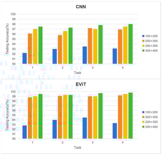 A particularly noteworthy observation concerns the differential impact of ROI scaling—the EViT architecture demonstrates significantly greater accuracy enhancement compared to its CNN counterpart as ROI dimensions increase. This phenomenon underscores EViT’s superior capacity for processing expanded input domains, attributed to its enhanced ability to capture extensive spatial dependencies and integrate global contextual features. Such characteristics substantiate the transformer-based model’s advantages in machine condition monitoring applications.