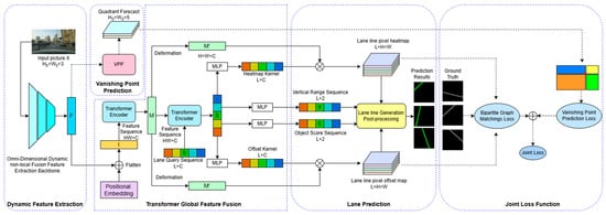 The network architecture of OTVLD-Net consists of the dynamic feature extraction network ODVT-Net, the vanishing point detection module, the Transformer global feature aggregation module ODVT-Net, the lane detection module and the joint loss module, as shown in Figure 1. The model consists of a sequence of modules that process information in different ways: