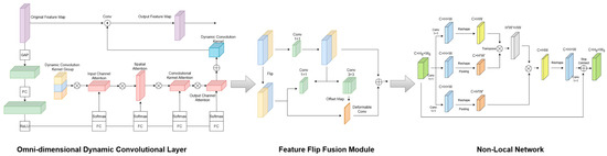 The omni-dimensional dynamic convolution operation (Figure 2, left) uses a new multi-dimensional attention mechanism and parallel strategy. ODConv dynamically learns the attention of the convolution kernel along the four dimensions of the kernel space in the convolution layer, thereby better capturing the feature information of the input data, allowing the network to better adapt to different input data and improve the perception and generalization capabilities of the model. At the same time, there is no great sacrifice in the amount of model calculation. The dynamic convolution operation can be regarded as a dynamic perceptron , and its calculation process is as follows: