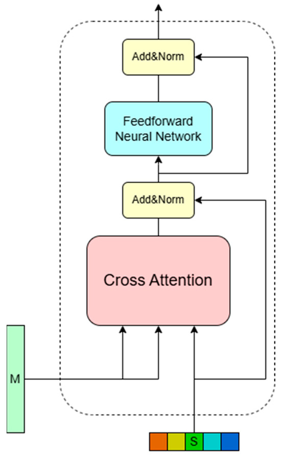 To generate dynamic feature weights for each lane line candidate, the Transformer global feature aggregation module is designed in this paper, as shown in Figure 3. The encoder of the model takes the feature sequence as input, uses the Transformer self-attention mechanism to capture each of the most relevant input features in I, and outputs the feature sequence . However, this module discards the mask-self-attention module in a typical Transformer decoder, and defines a learnable lane query sequence , where vectors of length represent different lane line candidates, and this query sequence will be directly used as the query sequence of the decoder’s self-attention module after a linear transformation. At this time, the decoder self-attention module integrates the cross-attention mechanism to capture the most relevant features from the feature sequence for each lane line query in . Finally, the decoder will output the dynamic lane feature sequence . The functional relationship between the query sequence and the feature sequence in the cross-self-attention mechanism is as follows: