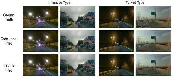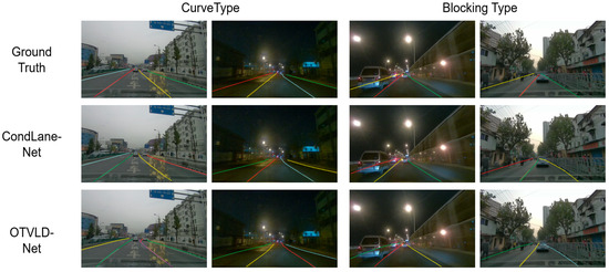 The performance on the CurveLanes dataset is shown in Table 3. The CurveLanes dataset contains lane lines with complex topologies and occlusion phenomena, such as curved, bifurcated, dense, and blocked lane lines. Using ResNet-18, ResNet-34, and ResNet-101 as templates for the feature extraction network, OTVLD-Net achieved F1 scores of 87.86%, 88.16%, and 88.35%, respectively, and improved 2.90%, 2.51%, and 2.38%, respectively, over CondLaneNet, which had the next highest performance. Meanwhile, some qualitative comparison results on the CurveLanes dataset, which are classified into four categories: curvilinear, blocked, dense, and bifurcated lane lines, are presented in Figure 4 and Figure 5 The experimental results show that OTVLD-Net is able to effectively deal with the obstruction problem as well as lane lines with complex topologies.
