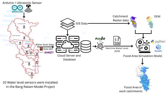 To effectively monitor flood dynamics in the Bang Rakam model area, this study integrates low-cost IoT-based water-level sensors with a flood simulation model [25]. The approach involves deploying sensors across multiple stations to collect high-frequency water-level data, which is then processed and analyzed to generate spatial flood extent and depth maps [16,26]. By combining sensor-based measurements with geospatial analysis, the system provides a cost-effective and automated alternative to traditional flood monitoring method [27,28,29]. The following sections detail the sensor deployment strategy and the flood model development process, describing the hardware components, data transmission methods, and analytical techniques used in this study. Figure 1 demonstrates the concept of this framework; 10 water-level stations, coupled with Arduino and ultrasonic technology, have been installed in the Bang Rakam model area. These sensors collect water-level data and send it to a cloud server using Message Queuing Telemetry Transport (MQTT) protocol, which uses Node-RED for data management and API interaction [30]. The cloud architecture saves and processes water-level data at predetermined time intervals, sending JSON outputs to modeling applications. Python-based flood simulation models, powered by libraries like NumPy, combine GIS data, such as catchment raster data and DEM, with water-level data. In this study, the DEM used for topographic analysis and floodplain modeling was obtained from the Regional Irrigation Office 3, which provided high-resolution elevation data critical for accurately simulating water flow and inundation patterns. Specifically, the elevation data corresponds to a Digital Terrain Model (DTM), which represents the bare-earth surface without including buildings, vegetation, or other above-ground features, ensuring more precise hydrological modeling than a Digital Surface Model (DSM) would allow. The produced models predict flood-prone areas in all catchments, resulting in flood-prone maps. These catchments were delineated through hydrological analysis performed on the DEM using r.basin in GRASS GIS.