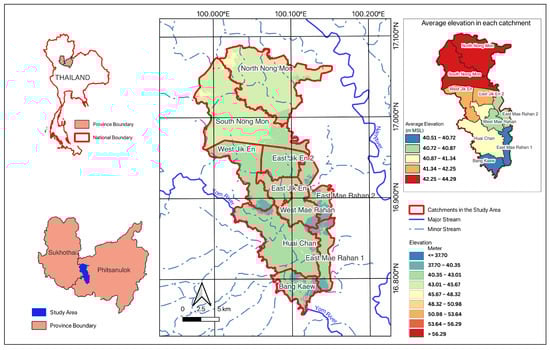 The Bang Rakam model area, as shown in Figure 2, is located in lower Phitsanulok province and serves as a designated flood retention zone. This region is primarily a floodplain, characterized by vast expanses of rice paddies and low-lying farmland that are prone to seasonal flooding. The area’s natural topography allows it to temporarily store floodwaters before gradual drainage into the Nan River system, reducing the severity of flooding in downstream areas. Encompassing approximately 360 square kilometers, this strategic area is situated between two major rivers: the Yom River and the Nan River. Within the study area, a dense network of canals crisscrosses the landscape. The average elevation of the Bang Rakam model area is approximately 41 m above mean sea level (m MSL), with elevations ranging from a minimum of 38 m MSL to a maximum of approximately 59 m MSL. The area receives an average annual rainfall of approximately 1297.513 mm, with the highest precipitation typically occurring from September to October. The study area features a network of irrigation canals, reservoirs, and floodplains, which play a crucial role in water retention and distribution. These water bodies influence the spatial and temporal variations in flood depth and duration, making it essential to understand their hydrological interactions for effective flood assessment and management.