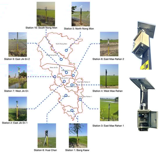 As seen in Figure 4, all ten stations were placed in the Bang Rakam model area, with sensor locations determined based on field surveys conducted by the Regional Irrigation Office 3. The site selection criteria began with identifying the lowest elevation point within each catchment area to ensure early detection of floodwater accumulation. Following this, the feasibility of installation was assessed based on accessibility, signal availability, and the ability to obtain permission from local landowners or stakeholders. Details of the installation locations are provided in Table 1.