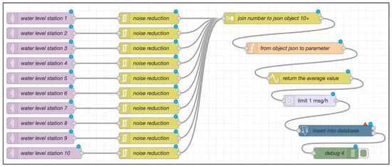 The system was tested and installed over a 12-month period, as summarized in Table 3. Data transmission is configured to occur once daily during the initial phase when water has not yet entered the area (January–July), primarily to test and verify the system’s functionality of power, Wi-Fi signal, and battery without using any water-level thresholds. Once water begins to flood into the area (August), the transmission frequency is manually adjusted to once every hour to enable near real-time monitoring. This adjustment is made by modifying the limit function within the Node-RED workflow, allowing for flexible control of data transmission rates based on changing flood conditions. Spatial analysis techniques are used to further evaluate the data once it has been placed in the database. An example of the Node-RED workflow is shown in Figure 5, where the parameter limit is set to one message per hour (msg/h), allowing data transfer to happen once every hour. The average value determined over the course of an hour is represented by each transmitted message.