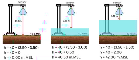 A flood simulation model was created utilizing water-level data obtained from ten sensor locations in the Bang Rakam model area. The system incorporates a variety of data sources, including real-time water-level data from sensors, raster-based catchment area information, and DEM data [4,5]. These datasets are run via a simulation algorithm that predicts flood extent and depth in the selected catchment regions. Figure 6 illustrates an example of how water surface elevation (in meters above mean sea level, m.MSL) is calculated using distance measurements from the sensor based on a known ground elevation of 40.00 m.MSL and a fixed sensor height of 3.50 m above the ground; as the water-level rises, the measured distance decreases accordingly, allowing for precise computation of water surface elevation.