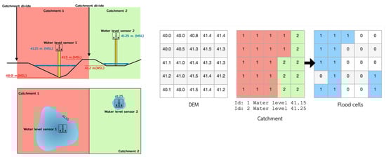 - Flood Calculation: Depending on the level of each catchment region, designate a cell as flooded (1) if its DEM value is less than the sensor water level and as dry (0) otherwise.