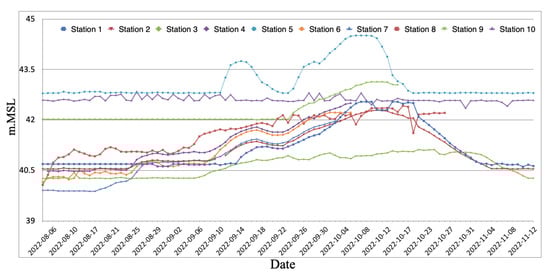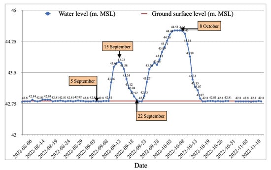 A graph of water-level readings taken at Station 5 is shown in Figure 9, which illustrates how the water level (measured in m.MSL) has changed over time. The red line indicates the station’s ground surface level, and the blue line shows variations in the water level. According to the graph, water levels first stayed constant before beginning to rise in mid-September and peaking at about 44.51 m.MSL in early October before progressively dropping back to normal levels in mid-November. With separate input and outflow times, the observed pattern accurately depicts the seasonal flood dynamics in the study area.