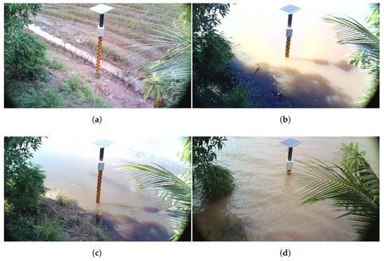 A visual record of the flooding advancement on 5 September, 15 September, 22 September, and 8 October is shown in Figure 10, which is taken from the monitoring camera at Station 5. The sensor is positioned in a rice field in the first photograph (5 September), which depicts a dry environment. Water gradually submerges the staff gauge as the flooding worsens, and on 8 October, the water level is significantly higher, matching the peak levels shown in Figure 9. The automatic water-level monitoring system’s dependability is shown by these pictures, which visibly validate the sensor data. These images together show how the sensor-based monitoring system efficiently records flood dynamics, offering both visual and numerical confirmation—both of which are essential for flood control and decision-making in the Bang Rakam model region.