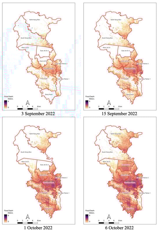 This paper estimated water depth levels in near real time and created flood maps using a flood analysis algorithm, as mentioned earlier. Complete data from all 10 stations was only accessible until 6 October 2022, due to damage at Station 7 and equipment collection from Stations 4 and 6 on 7 October 2022. In order to represent the scope and evolution of floods, flood simulations were run on 3 September, 15 September, 1 October, and 6 October 2022. The generated flood depth maps from the simulation are illustrated in Figure 11.