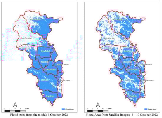 The comparison of flood maps produced by satellite imagery analysis and simulations reveals both parallels and discrepancies in the forecast of flood extent. We produced a simulated flood map for 6 October 2022, for this study and contrasted it with flood maps created from satellite imagery taken between 4 October and 10 October 2022. This time range was required because a single satellite overpass could not fully cover the study area due to revisit limitations. The satellite-derived flood maps used for comparison were obtained from secondary data provided by the Geo-Informatics and Space Technology Development Agency (GISTDA). These maps were generated through the interpretation of multi-source satellite imagery, including Sentinel-1, Sentinel-2, RADARSAT, COSMO-SkyMed, and other SAR (Synthetic Aperture Radar) datasets. The data is publicly available as open data and is released by GISTDA during major flood events for public use and decision support. The overall flood boundary trends from both sources were aligned, as seen in Figure 12.