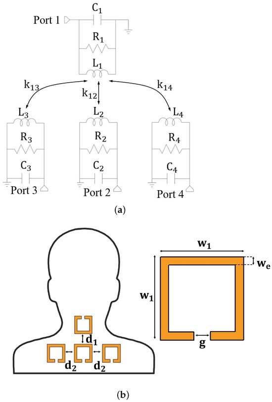 This approach enables non-intrusive posture monitoring. Changes in the transmission coefficients allow for the detection of posture deviations, such as forward head posture or lateral head tilt. Figure 2b illustrates the spatial arrangement of the resonators, optimized for capturing these variations.