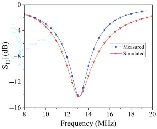 Once the inductor geometry was fixed, the optimization process continued with tuning the resonance frequency. To achieve resonance around 13.56 MHz—within the ISM band and suitable for low-power wireless systems—a set of measurements was performed by connecting different lumped capacitor values to the textile inductor. The reflection coefficient was measured using a portable NanoVNA to verify the resonance frequency for each capacitor value. This empirical tuning procedure led to the selection of a 1 nF capacitor, which resulted in a resonance frequency of approximately 13.12 MHz. According to this result and referring to the equivalent circuit illustrated in Figure 2, the values of the equivalent lumped parameters for the textile inductors are nH, .