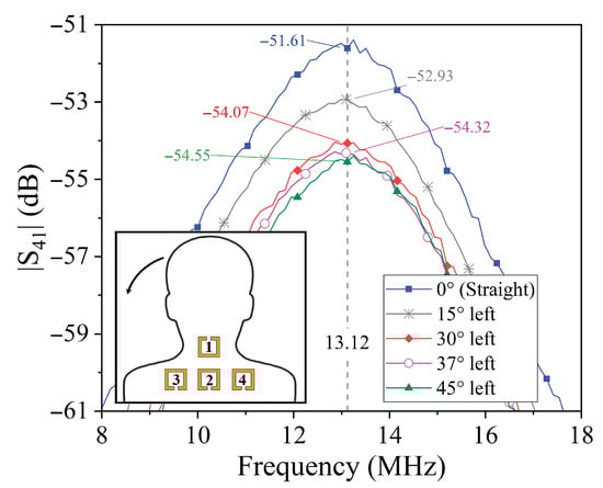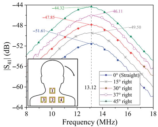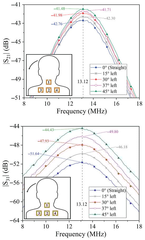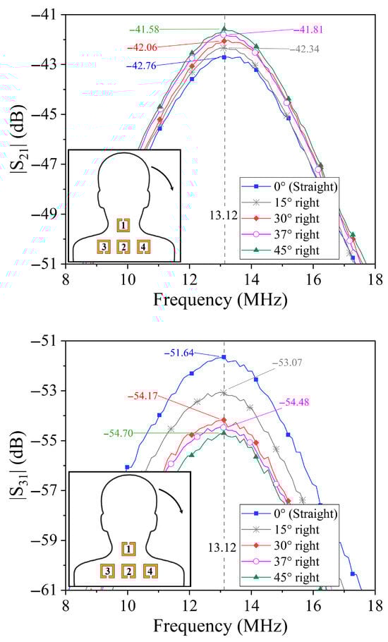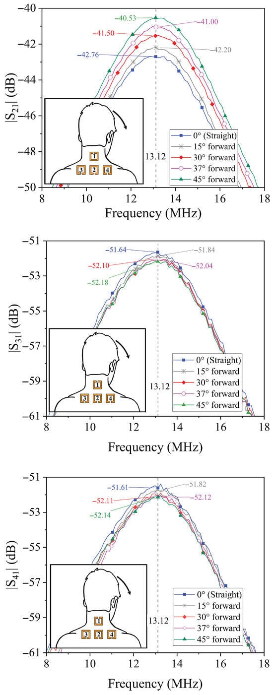 To validate the operating principle of the proposed posture monitoring system, comprehensive measurements of the transmission coefficients were conducted for various neck tilt angles, including both forward and lateral displacements. For each posture configuration, the complete set of transmission parameters with was acquired, corresponding to the signal transmitted from the resonator on the neck (port 1) to each of the three shoulder-mounted resonators (ports 2, 3, and 4).
