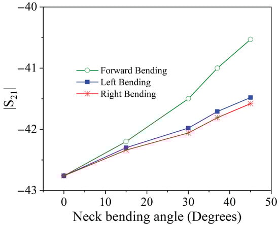 When the neck undergoes a forward tilt, the primary observable effect is a variation in the amplitude of the transmission coefficient . This behavior is expected based on the equivalent circuit model depicted in Figure 2, where a forward displacement predominantly alters the coupling coefficient between resonator 1 (placed on the neck) and resonator 2 (positioned on the shoulder). As the neck bends forward, the distance and alignment between these two resonators change, resulting in a measurable change in mutual inductance, and thus, in the transmission coefficient amplitude.