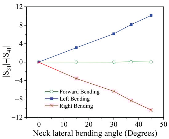 To illustrate this potential, Figure 8 presents the magnitude of the parameter at the resonance frequency as a function of the bending angle for both forward and lateral neck movements. Similarly, Figure 9 displays the difference between the amplitudes of the parameters and , also evaluated at the resonance frequency, relative to the same angular variations.