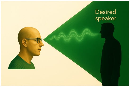 Beamforming is a spatial filtering technique that combines signals from multiple microphones to emphasize sounds from a desired direction while suppressing sounds from other directions [22,23]. Among the different approaches, the minimum variance distortionless response (MVDR) beamformer [24] is effective at separating sources; however, it often depends on additional information, such as the covariance matrices of the desired source and interference, as well as a voice activity detector (VAD). This reliance on such data can make it challenging to implement MVDR in real-time applications. On the other hand, the minimum power distortionless response (MPDR) beamformer does not require VAD, yet it remains vulnerable to steering vector errors [25], which are inevitable in dynamic environments. Region-of-interest (ROI) beamforming was recently proposed [26,27,28,29,30] to address this issue, offering a near-distortionless response over an angular sector rather than a single direction distortionless response.