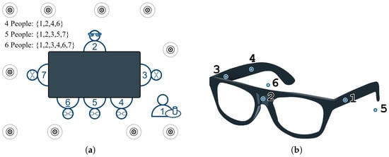 (a) SPEAR Challenge scene setup showing speaker positions around the table. (b) Head-mounted microphone array worn by person ID2, with six microphones labeled 1–6 [18,43].