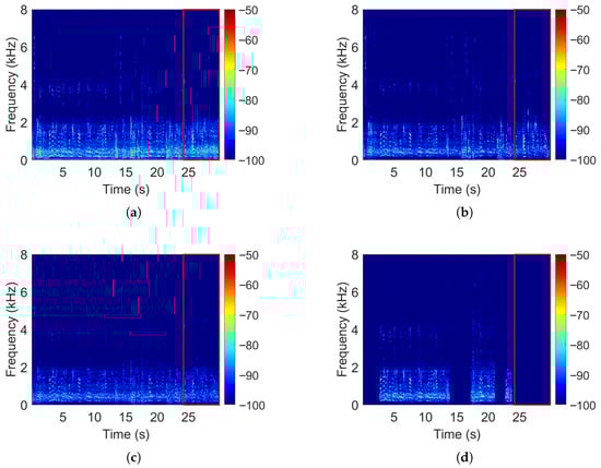 Spectrogram comparisons for (a) MPDR, (b) wMPDR-WPE, (c) MPDR-WPE, and (d) MVDR-VAD (ground truth). The red box highlights the interfering speech signal from Person 2 (microphone wearer).