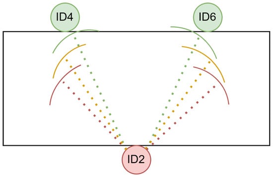 Schematic illustration of the azimuth-error experiment. The microphone wearer (ID2) is located at the bottom, with two potential target speakers (ID4, ID6) in front. The dashed lines indicate possible DOAs under varying steering errors: green (no error), yellow (), and red ().